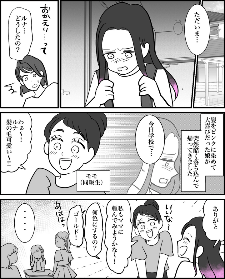 私はユウコ。小学5年生の娘・ルナはダンスに夢中で、日々レッスンに励んでいます。そんなルナが憧れているのはダンサーのマイちゃん。ピンク色の髪の毛が特徴的で、小中学生の女子に大人気の存在です。そんなある日、ルナが「髪をマイちゃんと同じピンクに染めたい」と言い出しました。ルナの思いは強く、私は美容師さんと相談して「毛先だけ染める」ことをOKしました。しかし数日後、学校から帰ってきたルナはとても落ち込んでいたのでした。