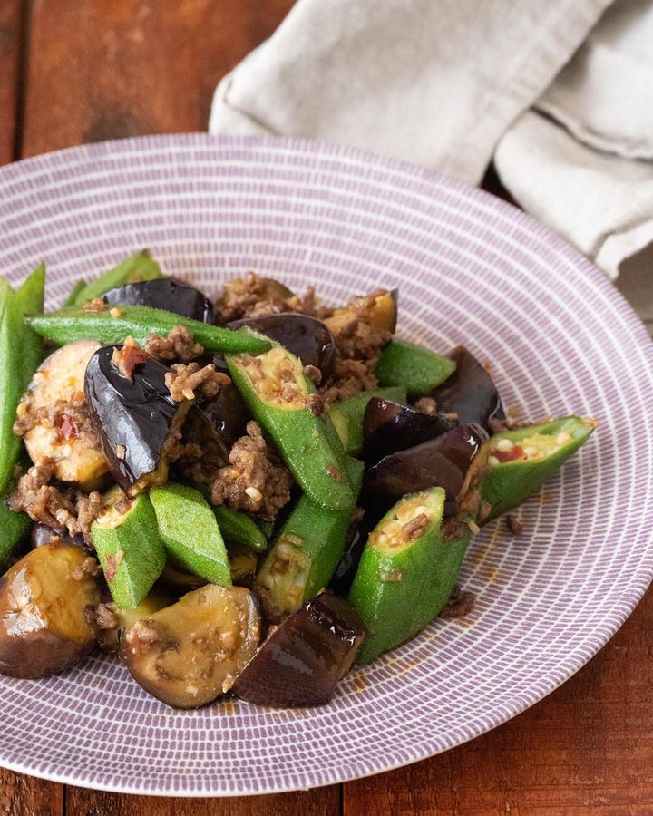 なすは油ととても相性がよく、炒め物にぴったりな食材。@morifu_popoさんの「秋ナスとオクラのピリ辛肉味噌炒め」は、柔らかななすと肉味噌のピリ辛風味との相性が抜群な一品です。