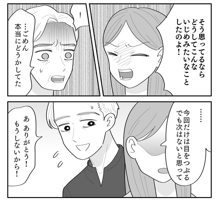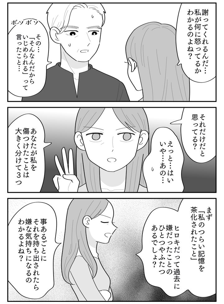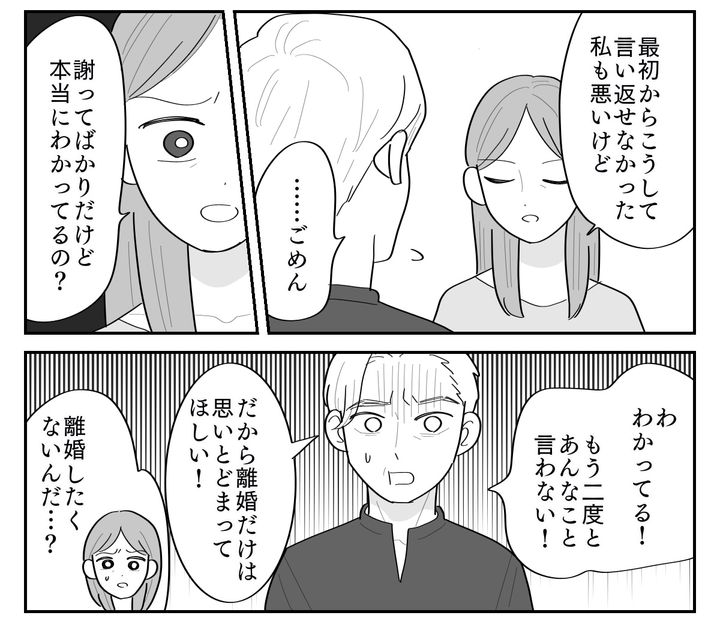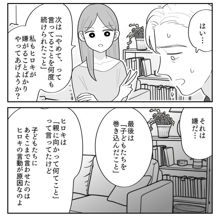 過去のいじめ経験を茶化されたこと、何度もやめてと言ったのに無視されたこと、子どもたちを巻き込んだこと……。私はこれまでのヒロキの言動を許すことはできません。なぜこんな人に言われたい放題だったのでしょうか。ヒロキが心を入れ替えると誓ったため、離婚はいったん見送りました。しかし次のチャンスはないと釘を刺しておきました。