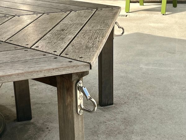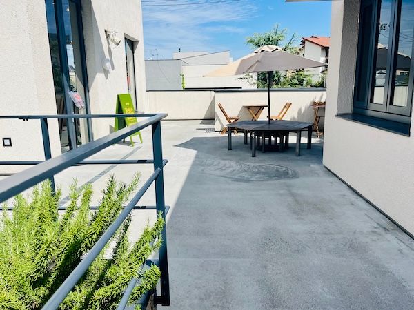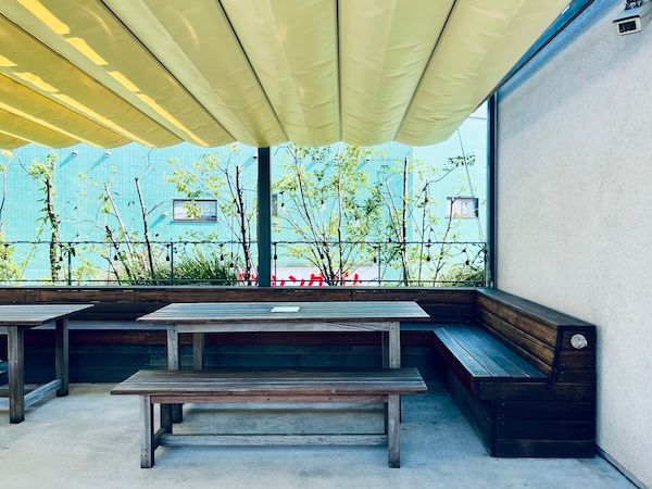 線路跡地にできた商業施設「reload」には、施設内で購入したものをテイクアウトして食べられる場所がいくつも用意されています。木製のテーブルやチェア、ベンチなどが店の外に配置されていて、秋の風を感じながら小さなお子さん連れやわんちゃん連れもほっと一息つけそうです。2階のテーブルにはリードを繋ぐフックがあったので、マナーを守ればわんちゃんと一緒に食事も楽しめそうです。