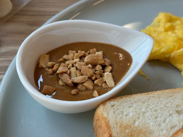 そして、ここでプラス150円すると…!木村ピーナッツといえばの名物「ピーナッツソフトクリーム」をデザートに追加できちゃうんです。ピーナッツの香ばしさとミルキーな甘さが絶妙で、本当に美味しいです。ドリンク付きなので、コーヒーのきりっとした苦みと一緒にいただけば、口の中がすっきり。まさに完璧なモーニングタイム。