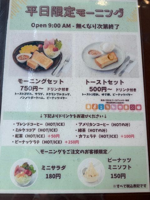 平日限定モーニングセットは、750円 トーストセットは500円どちらもドリンク付きでうれしい!