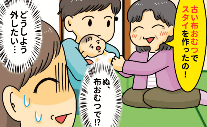 義祖母はニコニコ顔で「夫くんが昔使っていた布おむつで作ったの、子ども用品は高いから持って帰って」と娘の首にスタイを巻いたのです。「ぬ、布おむつでスタイを……!」と衝撃を受けている間に、目の前で娘に巻かれて私はビックリ。娘のためにと作ってくれた気持ちはとてもありがたいしうれしいのですが、スタイは口に触れる可能性がある物なので抵抗感があり……。心の中で「ひぇー!」と叫びながら夫を見ましたが、何も言ってくれません。幸い、夏だったので「ありがとうございます! でも、スタイをつけると暑いかもしれないので、今は外しておきますね」と何とか理由をつけて自然な流れで外すことに成功。その後は、車に積んで持って帰ることになりました。