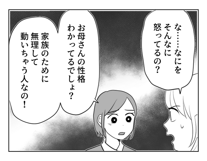 クルミさんのことは気にしないでおこう。自分は自分だから……と、気持ちを切り替えたはずのアンナさん。しかし目の前で「子どもの面倒を見てほしい>実母さんの体調」という構図を見せられてしまうと、思わず感情が爆発してしまいました。クルミさんのことをよく見てきたからこそ、一瞬の表情の変化を読み取ってしまうとは……。やはり本当は仲良しの姉妹なんですね。