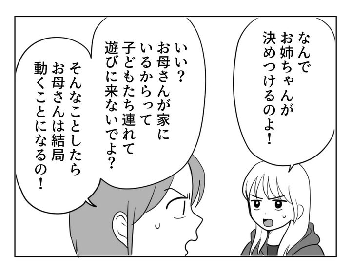 私(アンナ)は、夫のトオルと6歳の長女スミレ、3歳の長男レンの4人家族。共働きで、トオルは家事にも子育てにもとても協力的です。私の妹クルミのところにも子どもが2人います。クルミは専業主婦ですが、しょっちゅう実家の母に子どもたちを預けている様子。母は疲れきっています。なのでクルミに実家に行く頻度について話すと喧嘩になってしまいました。クルミのように素直に甘えられない私は、妹にコンプレックスを抱いていたのかもしれません。そんなある日、母が倒れ、しばらくは安静が必要に。それを聞いたクルミは「お母さん、パートをお休みしてしばらく家にいるの?」と少し嬉しそう。私は思わずキレてしまったのでした。