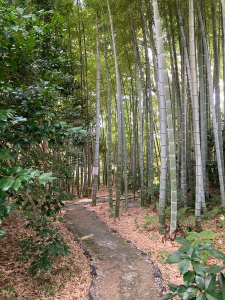 鶴川の駅から徒歩15分ということですが、今回は車で。駐車場は鶴川駅から最短の入り口とは別の入り口近くにありますので、ご注意を。駐車場に車を停めると、そこから敷地に入り、竹林の中を通り抜ける散策路を通ってチケット売り場に向かいます。