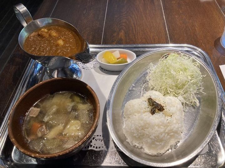 スパイスが調合されたカレー、私もキャベツもかけて食べてみました。何だか次郎さんを身近に感じました。スープには野菜がたっぷり入っていて美味しゅうございました。