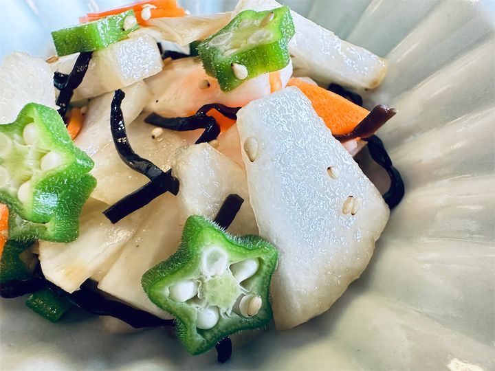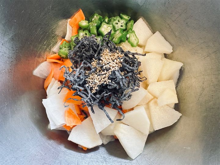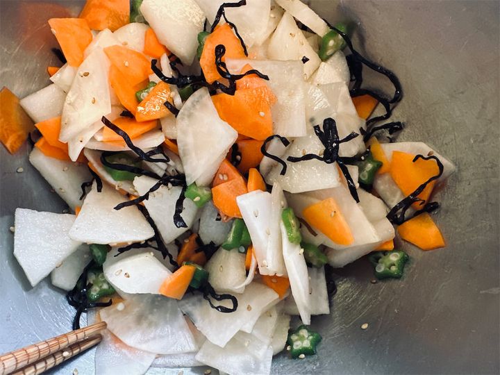 大根、にんじんの水気をしぼり、オクラ、梨を入れたら…