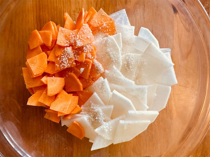 2. ボウルに大根、にんじんを入れ、塩をふり入れて、軽くもんでから10分ほど置く。