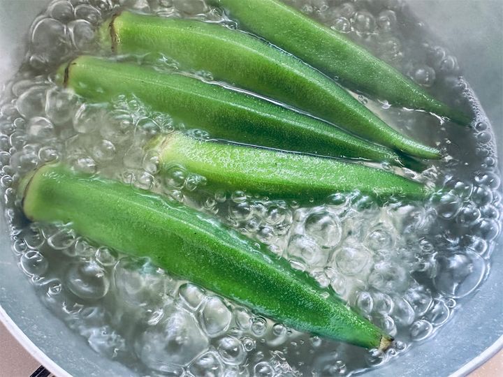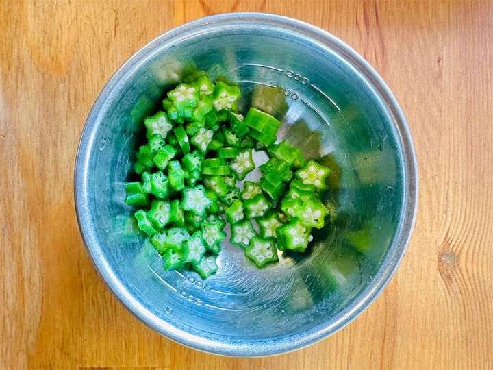3. オクラはさっとゆで、ヘタを包丁で削いでから薄切りする。