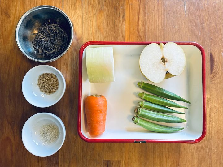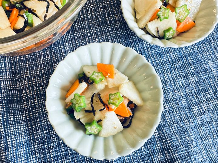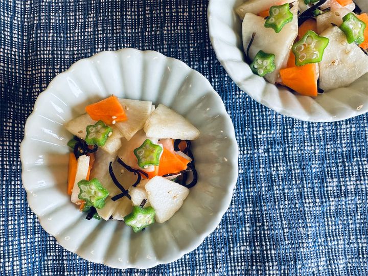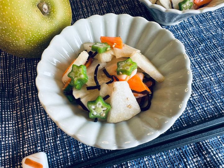 野菜の塩昆布和えレシピは数あれど、愛媛県の農家に教わったひと品は、いい意味でぶっ飛んでます!大根、にんじん、オクラの塩昆布和えに、今が旬の梨を1/2個も入れるんですって。この時点でしょっぱいの?それとも甘いの?と頭が疑問符だらけですが、さらに白いりゴマも入るっていうから、もう味の想像がつきません。でも、子どもの頃から梨♡ラブなワタシですもの…勇気を出して作ってみるぞ♪