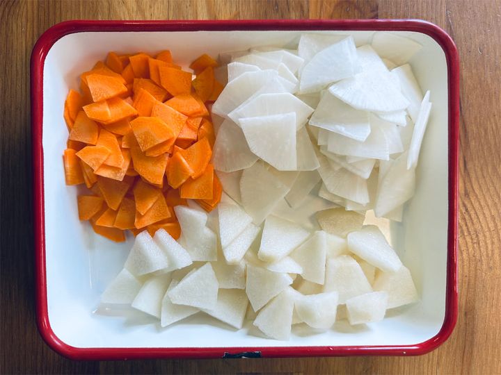 大根とにんじんは包丁で切りましたが、スライサーなどを使ってもOK。梨は食感を残すため少し厚めにカットします。