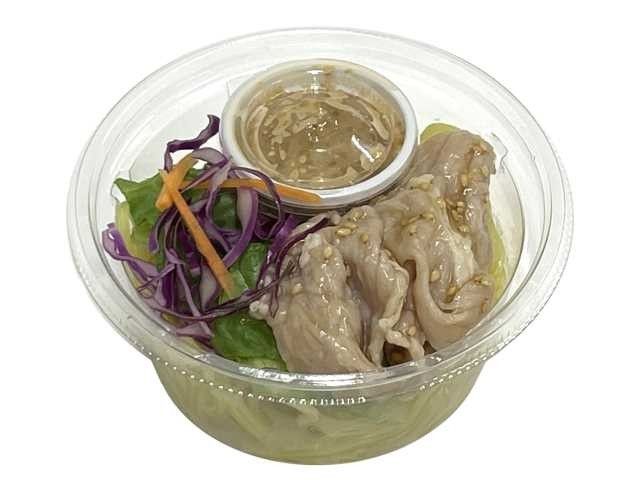 北海道産の豚もも肉を使用した豚しゃぶに、山わさびの辛味とマヨネーズのまろやかさを加えた胡麻ドレッシングを組み合わせたラーメンサラダです。