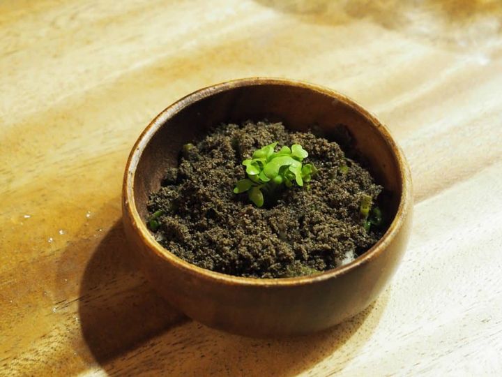 シグネチャーディッシュ。18種類の野菜が入っており、畑のような見た目の茶色のパウダーはなすの粉末。ピーナッツの甘みと野菜の食感が美味しい不思議な一皿!