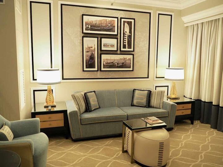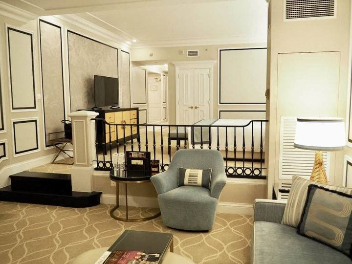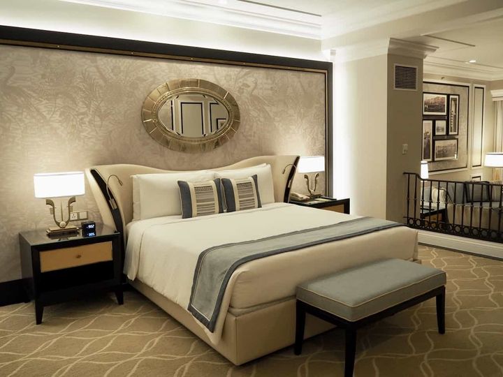 ホテルステイで重要視したいのが、お部屋のデザインや快適さ。「ザ ベネチアン マカオ」の客室は、ゴールドとブルーグレーを基調とした西洋風のデザインの上品な客室。大きなベットが贅沢に置かれたベッドルームと大理石をイメージしたバスルーム、センスの良いインテリア家具でコーディネートしたリビングはベッドルームと繋がっています。