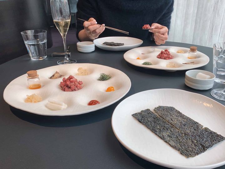 8種類の具をクレープのような生地に巻いていただく朝鮮の伝統的な宮廷料理、九節板(クジョルパン)をアレンジした人気メニュー。Jungsikではユッケを薬味と一緒に海苔に乗せていただきます。他ではなかなか味わえない、斬新な韓国料理に合わせた 豊富なワインリストも魅力。
