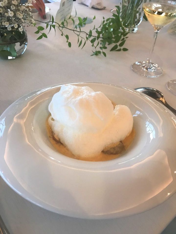 (雲ディナー)ふわふわのメレンゲでできた雲の下にはクリームチーズのニョッキが。