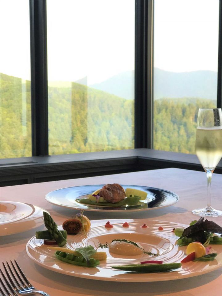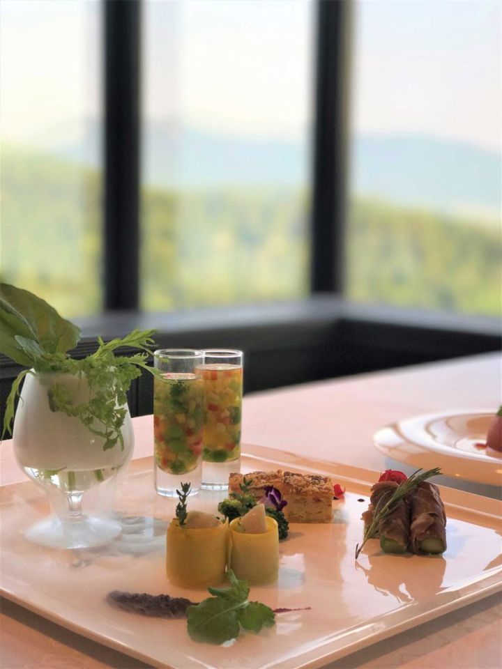 雲海が発生するトマムの大自然を表現した「雲ディナー」。こちらは早朝、トマムの自然に広がる雲海を表現したタパス。ツインタワーがかわいらしい!