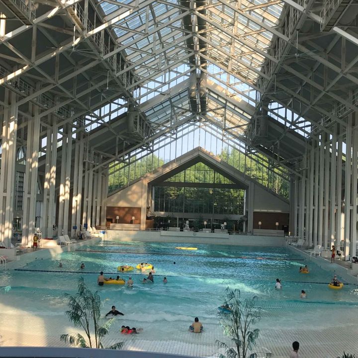 敷地内の温水プール「ミナミナビーチ」。とっても広い!そしてあったかい!一年を通して利用可能なので、冬にはスノボとプール、両方楽しむことができます。