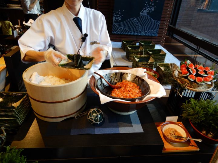 「ビュッフェダイニングhal」のコンセプトはカニ×サーモン。サーモンといくらの手巻き寿司など、名物メニューは目の前でつくってもらえます。