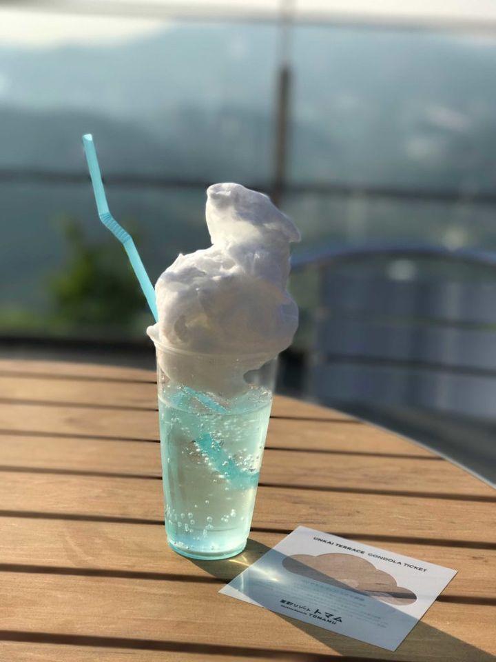 展望デッキにあるカフェでひと休み。綿あめがのった雲海ソーダなど、メニューももちろん雲海仕様です。