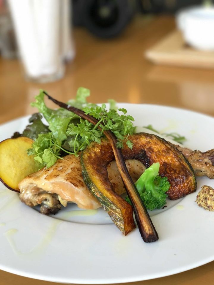 目の前に草原が広がるオシャレなレストラン「グリーンキッチン」でランチ。知床どり 鶏もも肉のコンフィ+新鮮な野菜は、見た目も味も◎!