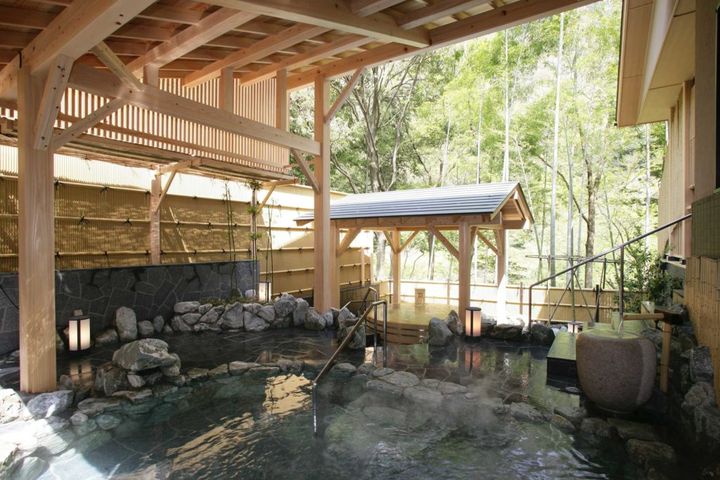 さらに女性専用スパ「やまざくら」(利用時間6時〜11時、15時〜23時)には、ぜいたくな3つの露天風呂と内湯があるんです。寝湯や樽風呂、岩風呂で心までリラックス♡ こちらは女性専用スパ「やまざくら」の岩風呂。