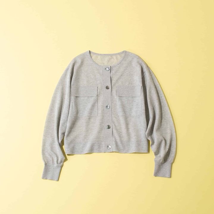 光沢感のある素材にさりげないポケットとデザインが効いた、モードなデザイン。着回し力も抜群で、これが1万円以下とは驚き。薄手のシアーカーディガンは、グレーの涼しげな色味で高温の室内や冷房下でも快適。コンパクトなシルエットなので、ワイドパンツにもタイトスカートにも自然になじみます。