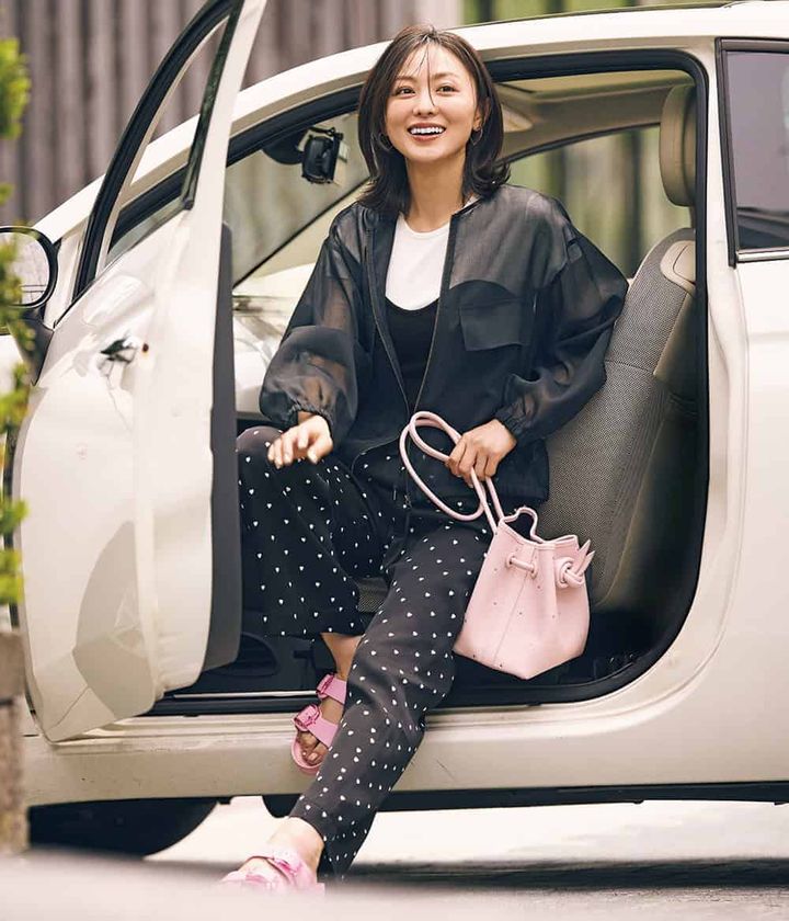 半袖ジャケット¥6,996(ロペピクニック/ベイジュ)ロゴTシャツ¥3,990(アンフィーロ)パンツ¥4,950(BASEMENT online)バッグ¥79,200(メゾン カナウ/ヤマニ)パンプス¥39,600(ピッピシック/ベイジュ)ベルト¥27,500(ニアー ニッポン/ニアー)スカーフ¥6,930(アンタイトル)メガネ¥39,600(プロポ/プロポデザイン)ピアス¥47,300パールネックレス¥46,200(ともにリューク)バングル¥7,560(アビステ)