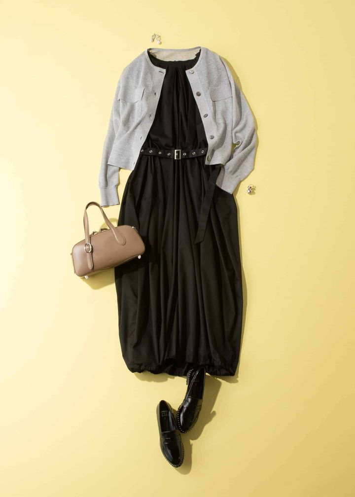 シアーカーディガン¥9,990(PLST)ワンピース¥41,800(リコ/リコトウキョウ)バッグ¥78,800(カフネ)シューズ¥17,600(ダイアナ)イヤリング¥79,20(イットアトリエ)太リング¥3,000 3連リング¥2,800(ともにセネ)