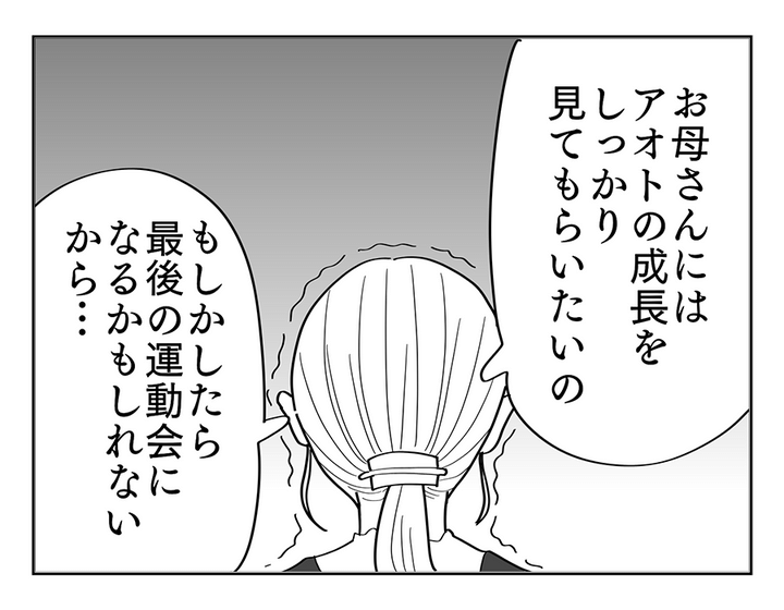 なるほど。エリさんは病気のお母さんが「もう二度と運動会を見られないかもしれない」と思っているのですね。アオトくんの成長をしっかり見届けてもらいたくて、義両親に遠慮してほしいと言っていたのですね。けれどそれは本当にお母さんが望んでいることなのでしょうか……? 義両親の存在が邪魔だと言っているようで、ちょっと気の毒にも感じてしまいます。