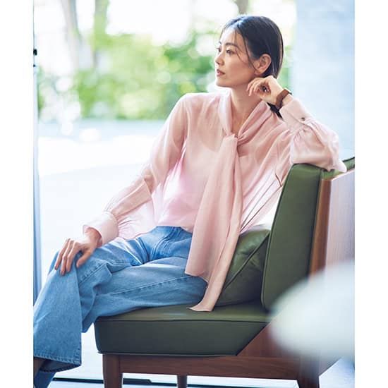ブラウス ¥14,960 (Day by Day) デニムパンツ ¥16, 500(ニードバイヘリテージ/ゲストリスト) 時計¥36, 300 (リップ/エイチエムエスウォッチストア 表参道)