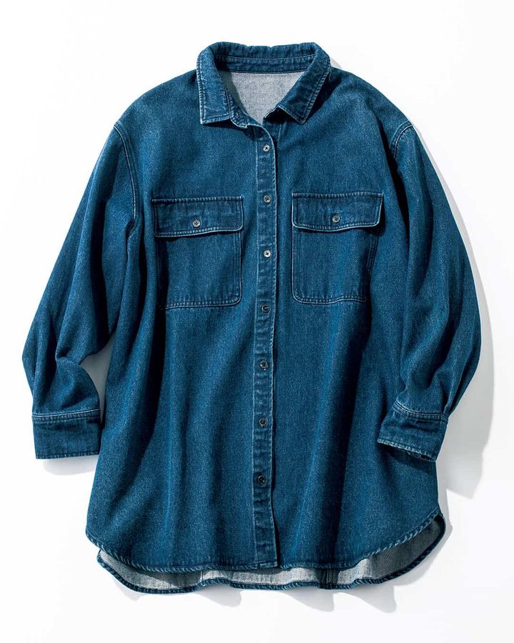 寒暖差のある季節の変わり目に重宝するデニムシャツをオン。1枚で着ても様になるオーバーサイズ感やきちんと感も生まれる濃いめのインディゴカラーのシャツはデニムボトムスとも相性抜群。足元はパンプスを合わせてバランスを取って。