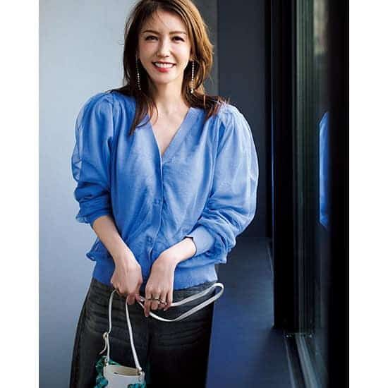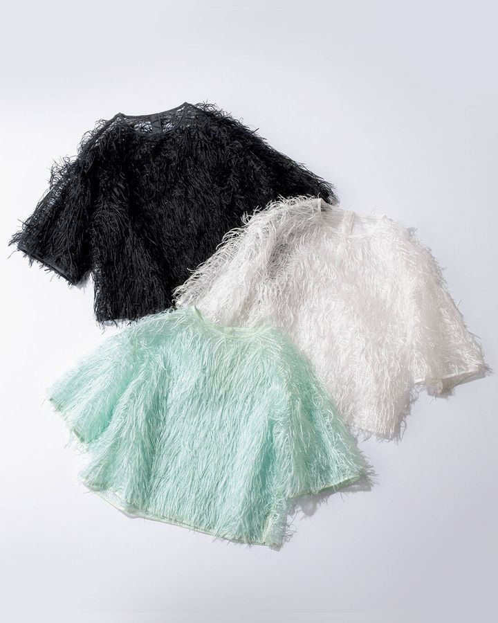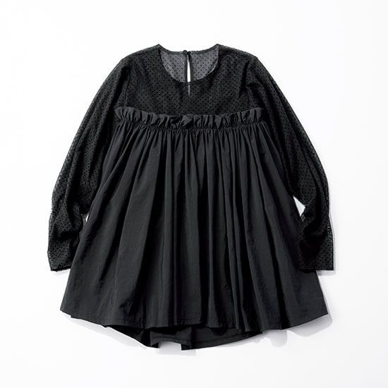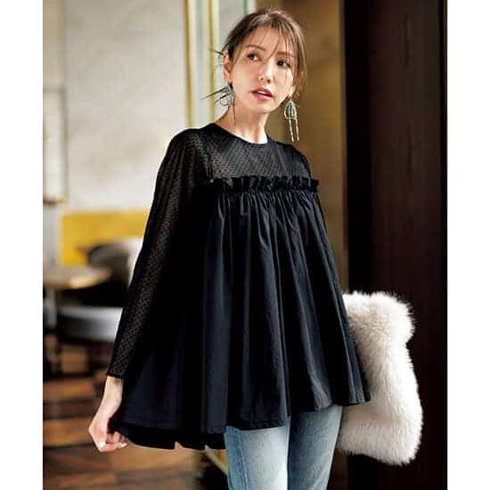 手持ちのデニムに鮮度が宿る優秀異素材トップス。チュールは透けすぎないようにドットに無地のチュールを重ねているので程よいシアー感を楽しめます。1枚で華やかな主役トップスにはデニムを合わせてバランスを取って。