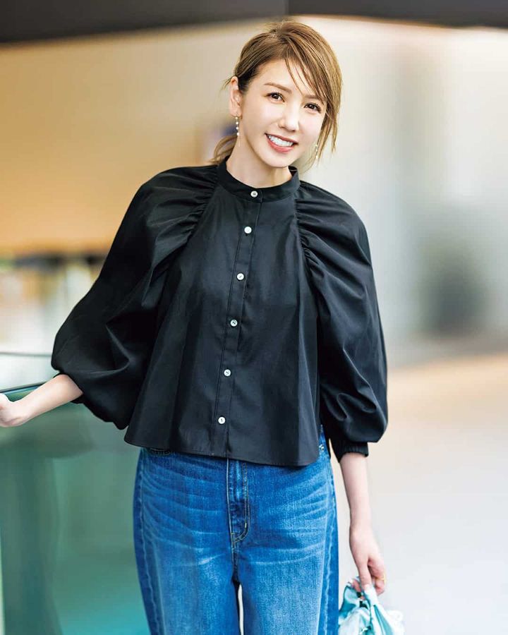 いつものデニムに袖にボリュームのある華やかブラウスを合わせれば、ママ友ランチでも好感度なコーディネートの完成。黒のトップスを合わせると馴染みがよく上品見えします。