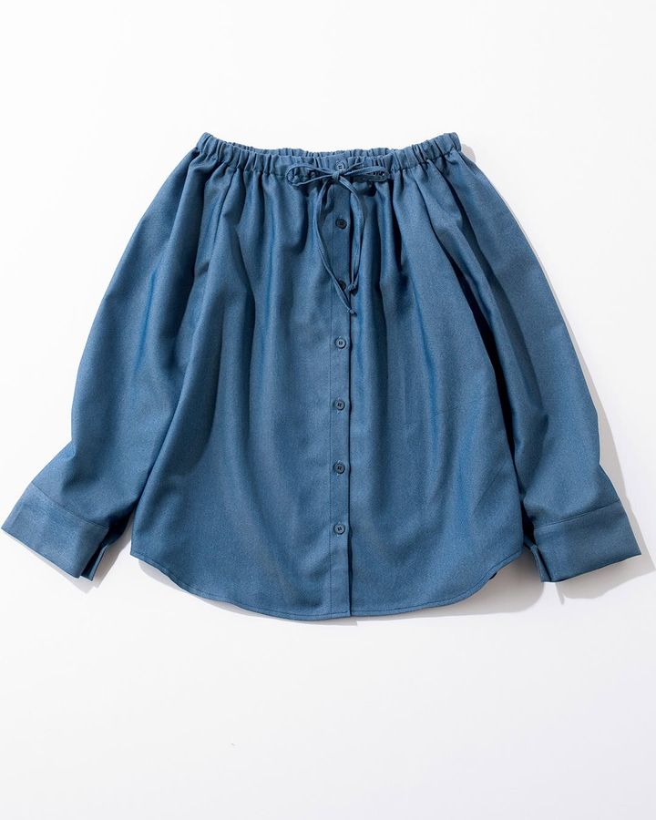 デニム見えする素材は軽やかで日中まだ暑い日もある今時期でもストレスなく着られます。リボンで絞れるギャザーがカジュアルさをプラス。同素材のパンツとセットアップで着用すれば、リラクシーな雰囲気に。