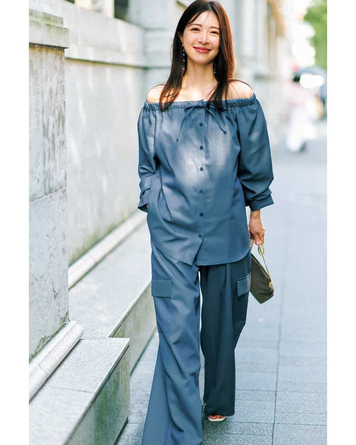 AMOMMAデニムライクオフショルブラウスデニムライクカーゴパンツ