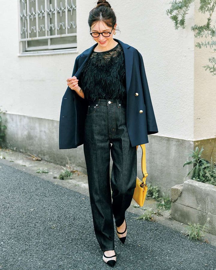②「黒ブラウス×デニム」でコンサバ派も安心な華やぎを