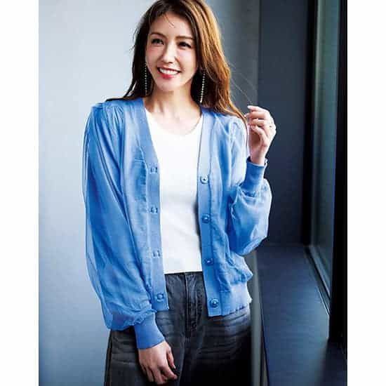 単なるベーシックではなく華やぎと品のよさが纏える大人カーデ。初秋には羽織りとして、本格的な秋が来たら1枚で活躍が期待できるカーディガンにチュールを被せてドレスアップした1枚はデニムと相性抜群。ワンツーコーデを華やげます。