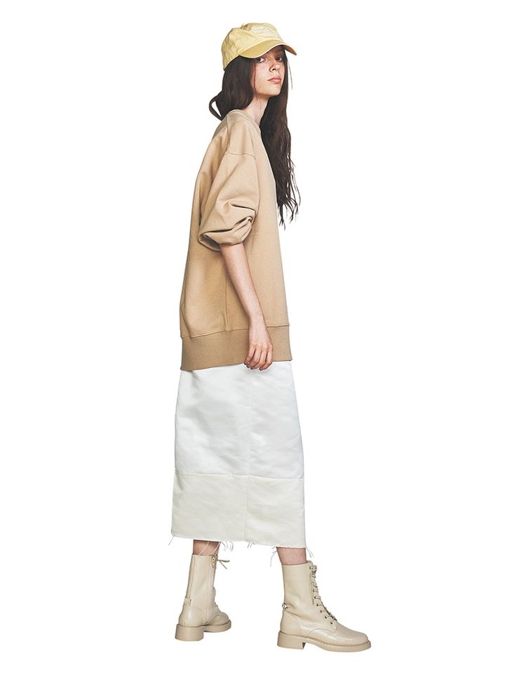 【POINT】ワンピースの腕まわりがすっきりしているから、立体的なのにトップスレイヤードが簡単。スエットや小物はボーイッシュなものを選びつつ、白となじみのいいベージュ系でまとめて、好感度を残すのが大人のさじ加減。