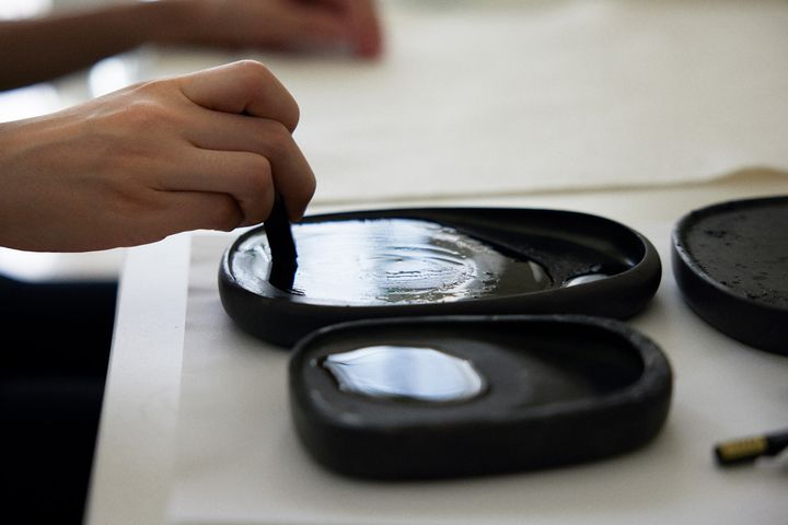 まずは、硯で墨をするところから。「墨汁はチューブのワサビで、硯ですった墨は生ワサビのようなもの(笑)。そのくらい違う」。