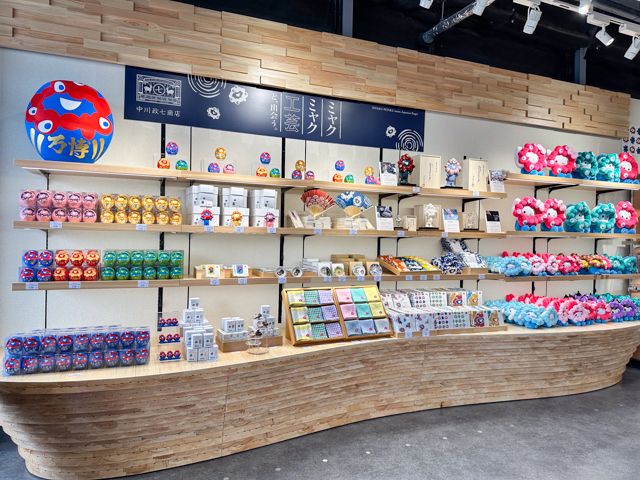 隣に位置する近鉄百貨店のストアは、「ミャクミャク百“価”店へ、いらっしゃい!」がテーマ。木調で統一された温かみのある店内では、関西銘菓から伝統工芸品まで幅広く展開されています。