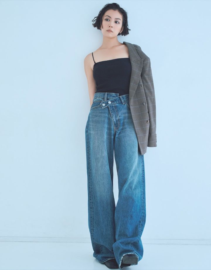 ちなみにスタイリングは、あくまでもデニムを主役にするのが正解かと。矢野さんのようにキャミソールを合わせるのも素敵ですし、シンプルな無地Tの合わせも洒落た着こなしに仕上がります。あと、このデニムの魅力を最大限に活かすなら、トップスはぜひタックインで。そうするとさらに脚長に見えて、かなりのスタイルアップを狙いちゃいますよ!