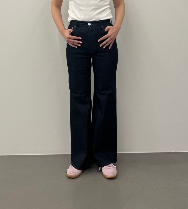まずは、『オトナミューズ10月号』で矢野未希子さんがはいていたのを見て、一番気になっていた「CROSS WAIST WIDE STRAIGHT」から試着してみました。こちらは2023年に登場して以来、売れに売れているというデザインデニムです。フロントボタンをサイドにずらしたようなウエストが気に入ったのですが、ウエスト位置もかなり高めなのではいていて安心感がありました。さらにフィットした腰まわりからストーンと落ちるワイドシルエットも相まって、想像以上の脚長効果を促してくれるのも最高! コットン100%なのに窮屈感がないはき心地も、40代にはうれしいですよね。