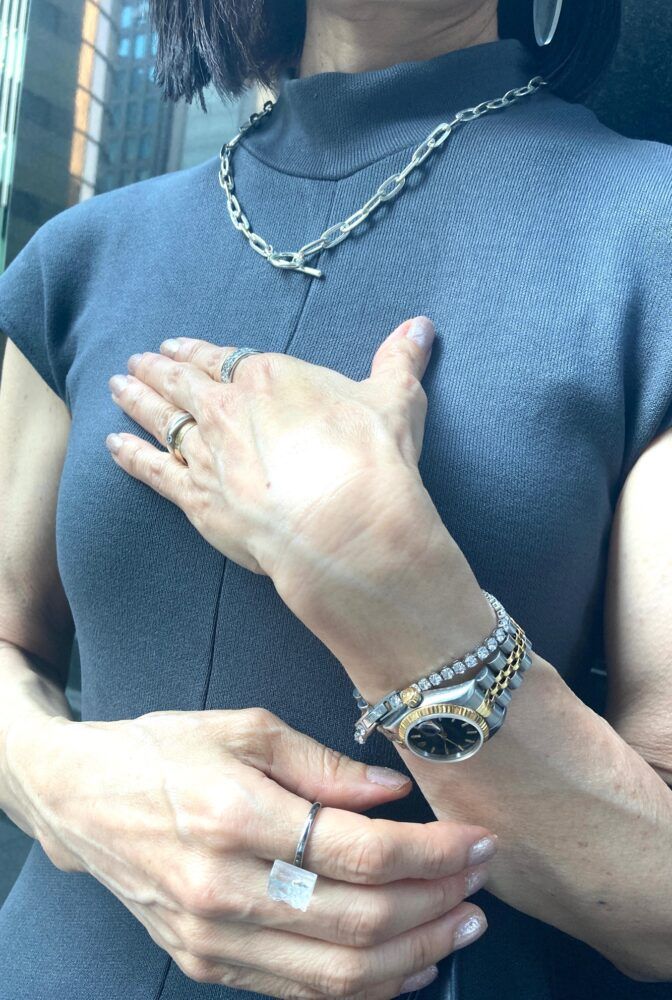 以前、カラー診断を受けてシルバーが似合うと言われた山田さん。「最近意識をしているせいか、シルバーアクセサリーを身につけることが多いですね。『ロレックス』の腕時計は、シックにまとめたくて文字盤がブラックのものを購入し、シルバーアクセサリーと重ねづけしています」