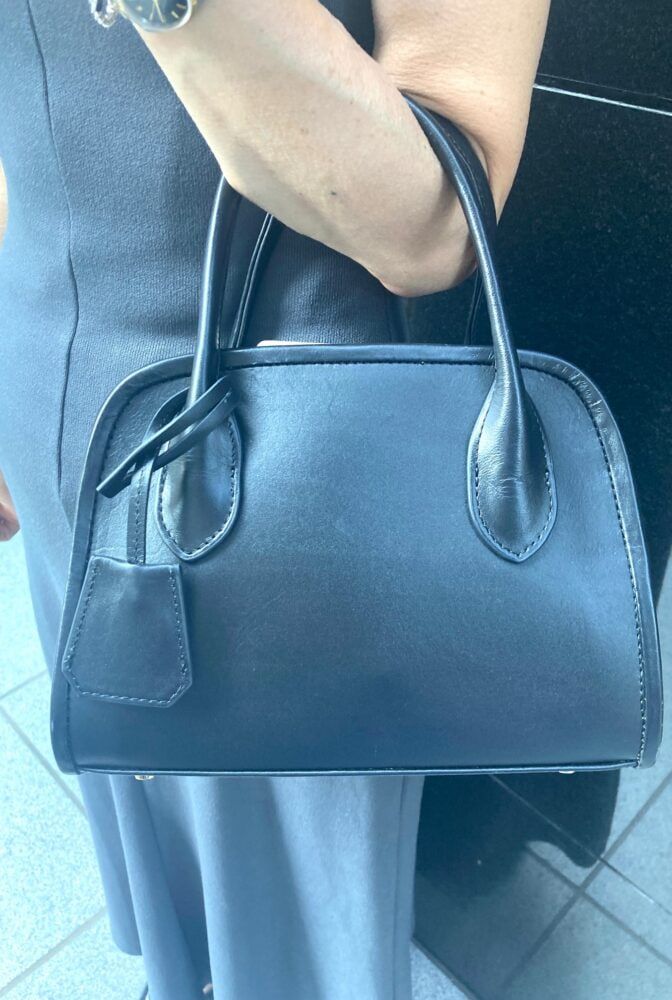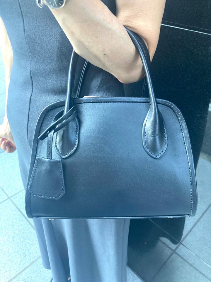バッグは「ウィム ガゼット」。「グレーと同系色でまとめました。ワンピースのカラーになじんでいい感じ。このバッグ、コンパクトに見えて収納力があるのでかさばる荷物や本も入って重宝しています」