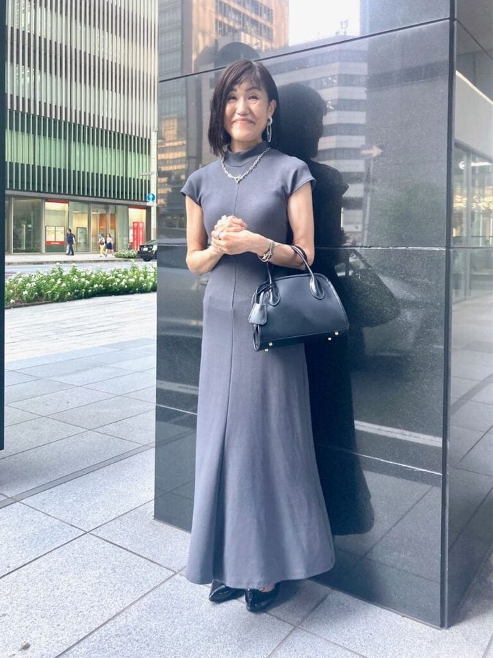 【60代お手本スナップ】「ZARA」のフェミニンなグレーワンピースとクールなシルバー小物を合わせた洗練されたスタイル!