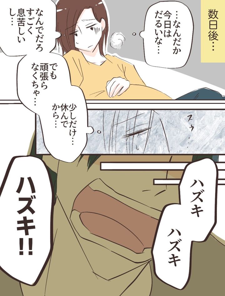「・・なんだか今日はだるいな・・・なんでだろ・・すごく息苦しいし・・。でも頑張らなくちゃ・・少しだけ・・休んでから・・」そう思っているとスゥっと眠ってしまいました。