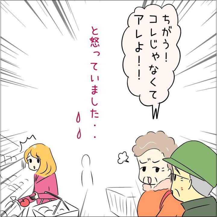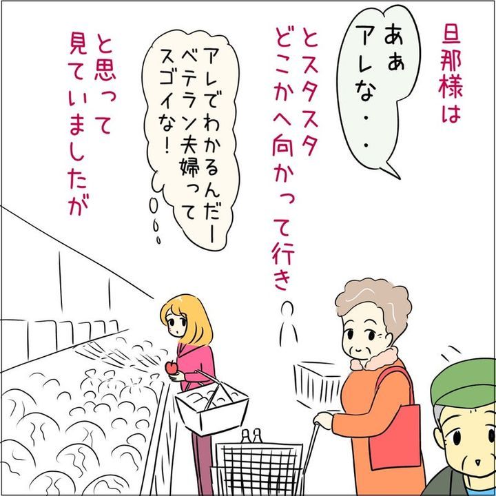 スーパーで年配の夫婦を見かけた読者。妻が「あれ必要でしょ!取ってきて!」と、夫にお願いしていたそう。商品を探しに行く夫を見て、「アレでわかるんだーベテラン夫婦ってスゴイな!」と感心していると、夫が商品を持って戻ってきます。かごに入れられた商品を見た妻は、「ちがう!コレじゃなくてアレよ!!」と怒るのでした。
