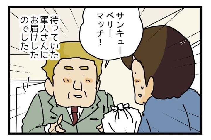 配達先に着くと、まずは守衛室のような場所で、ボディチェックや料理のX線検査といった、まるで空港のような荷物検査を通過…。そして料理を受け取り、入館すると、待っていた依頼主は軍人さんだったのでした!